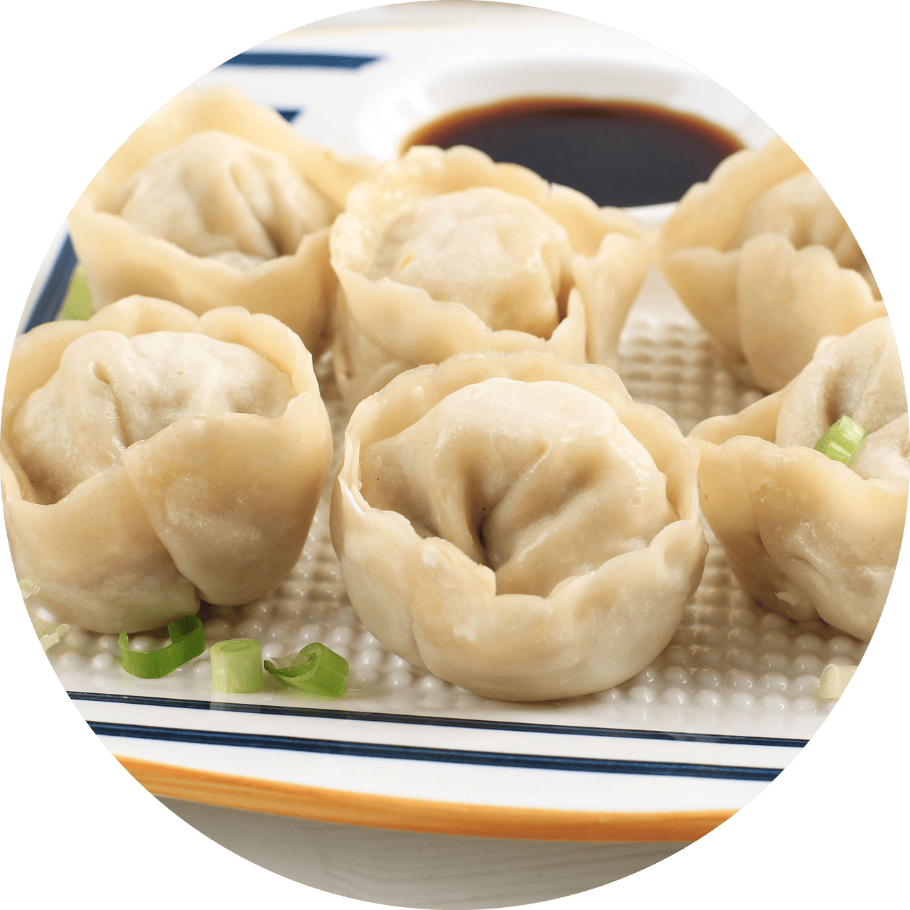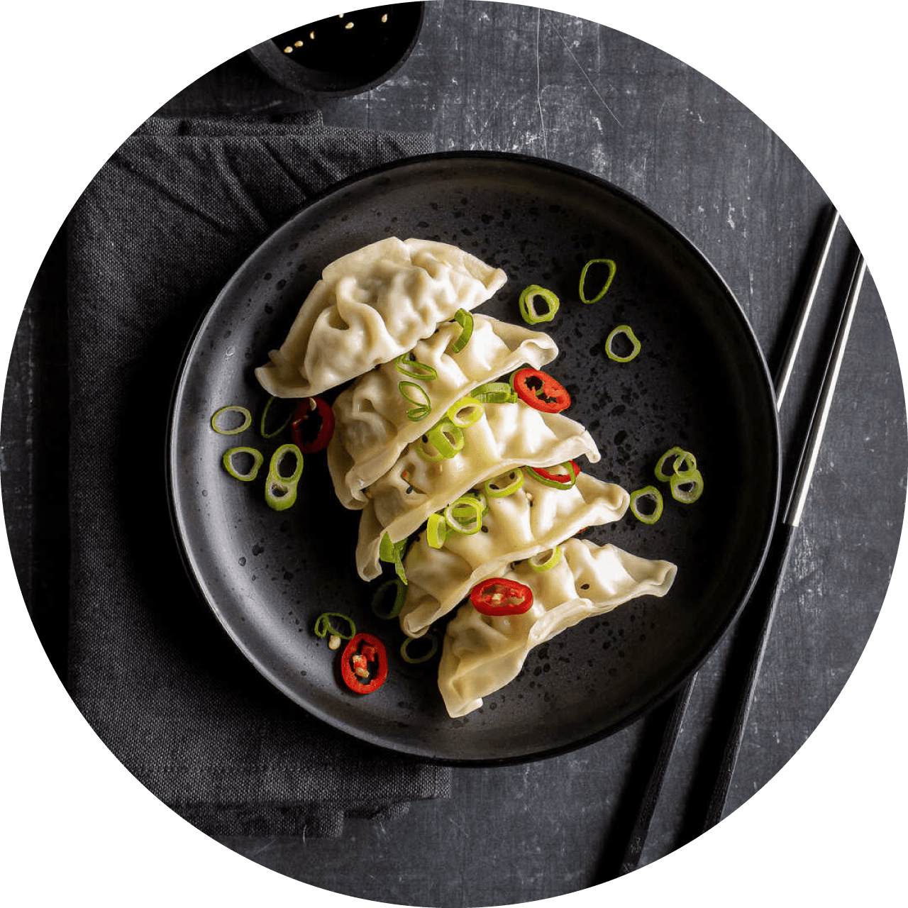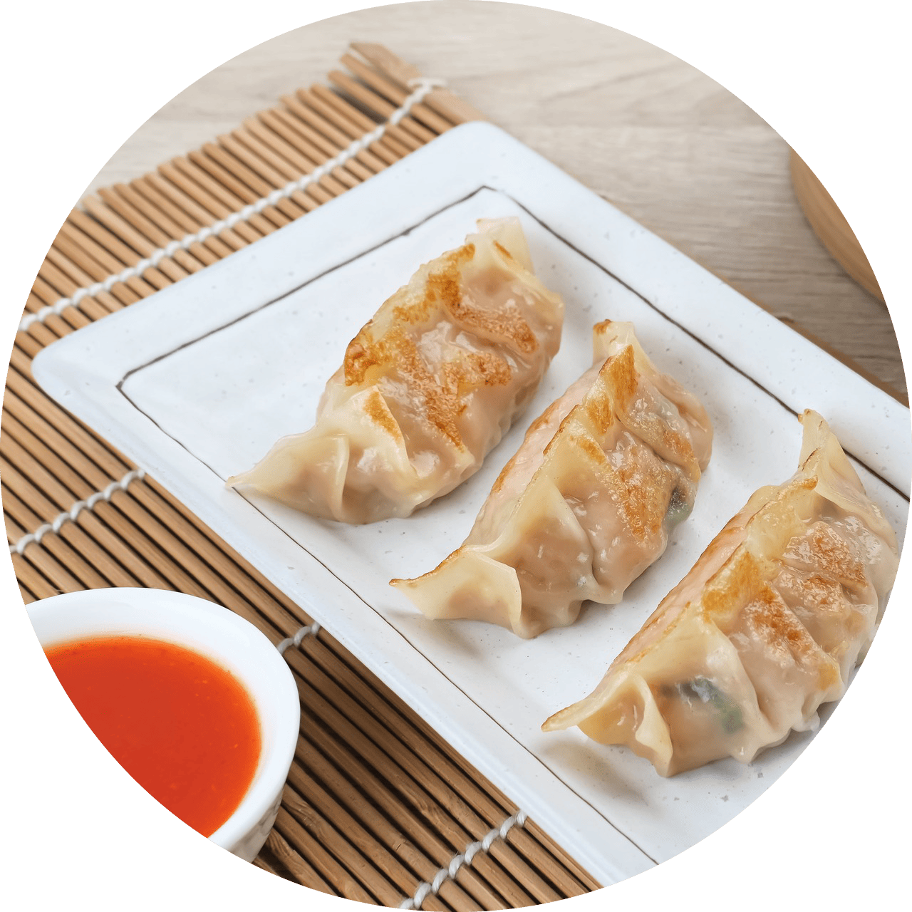 Dumplings congelados: carne molida de res, cerdo, vegetales, ajo, jengibre, salsa de soya, aceite de sésamo, chili oil, ajonjolí, harina de trigo, agua, sal y carbón de coco.