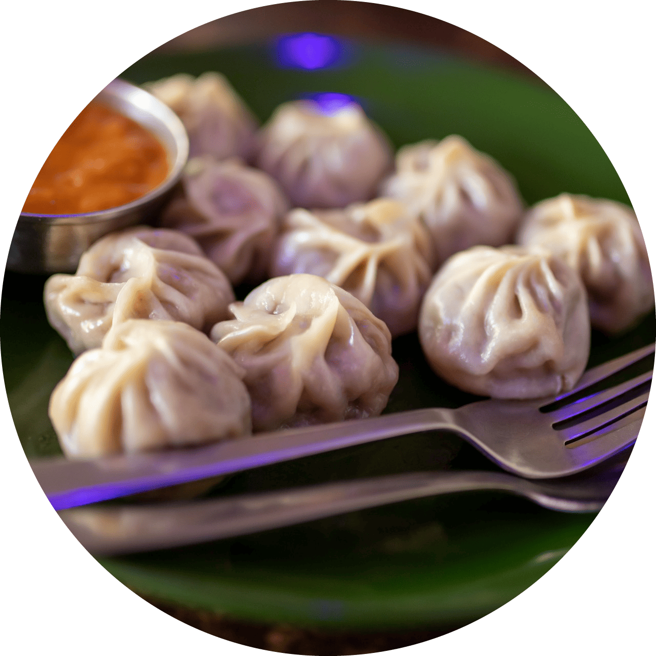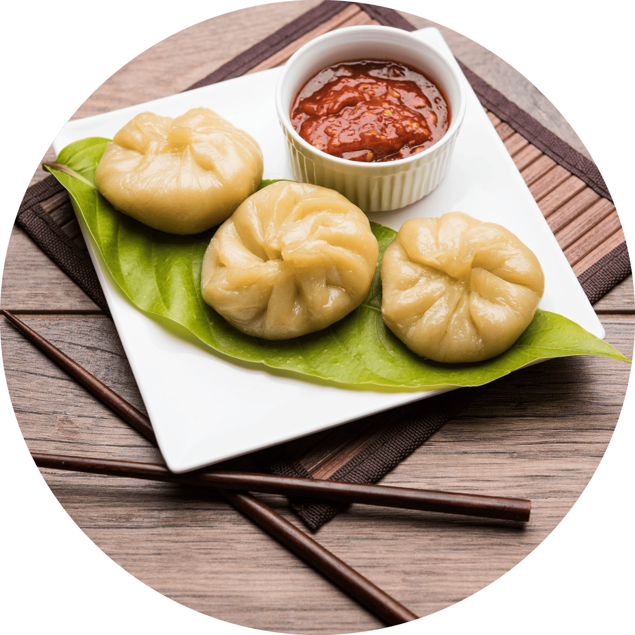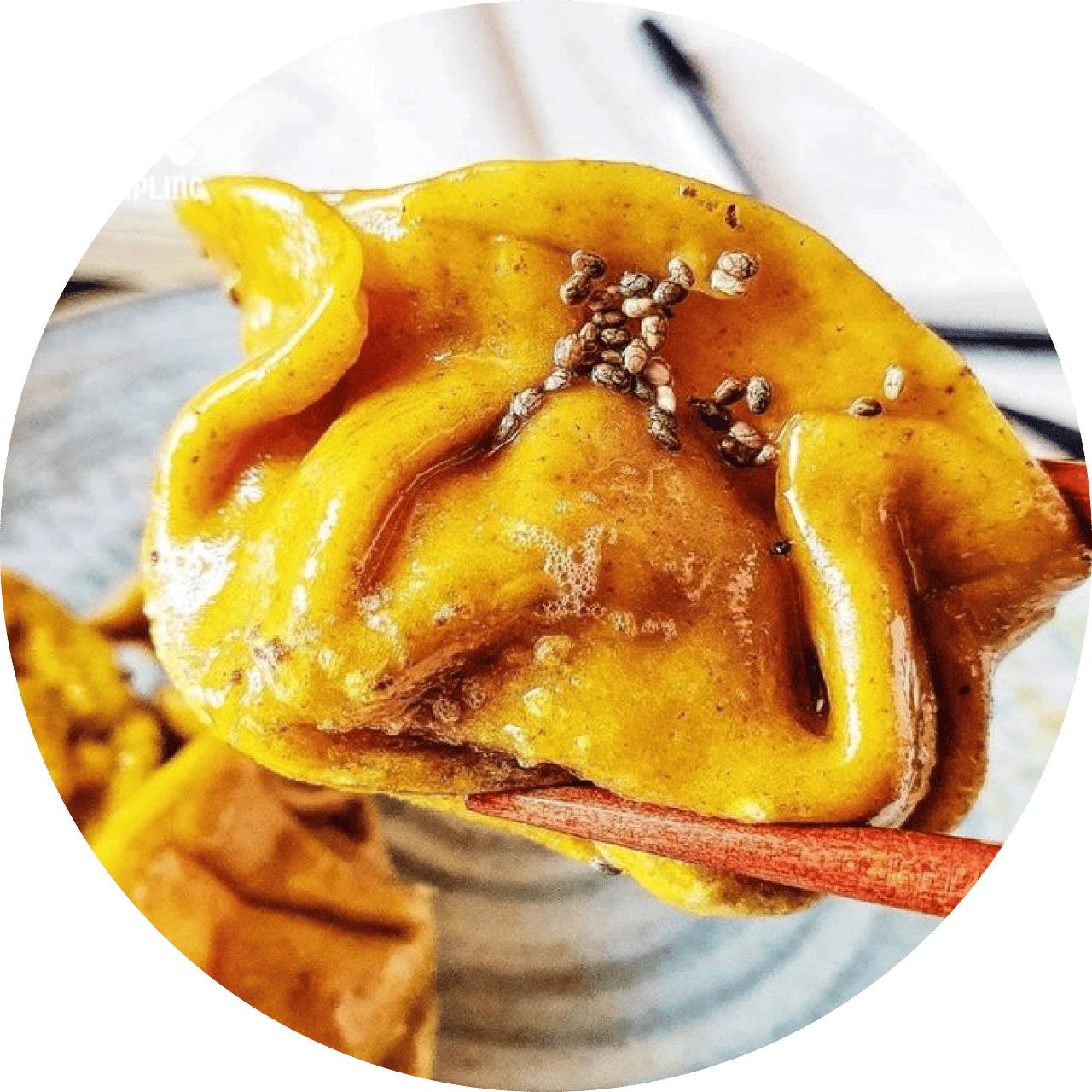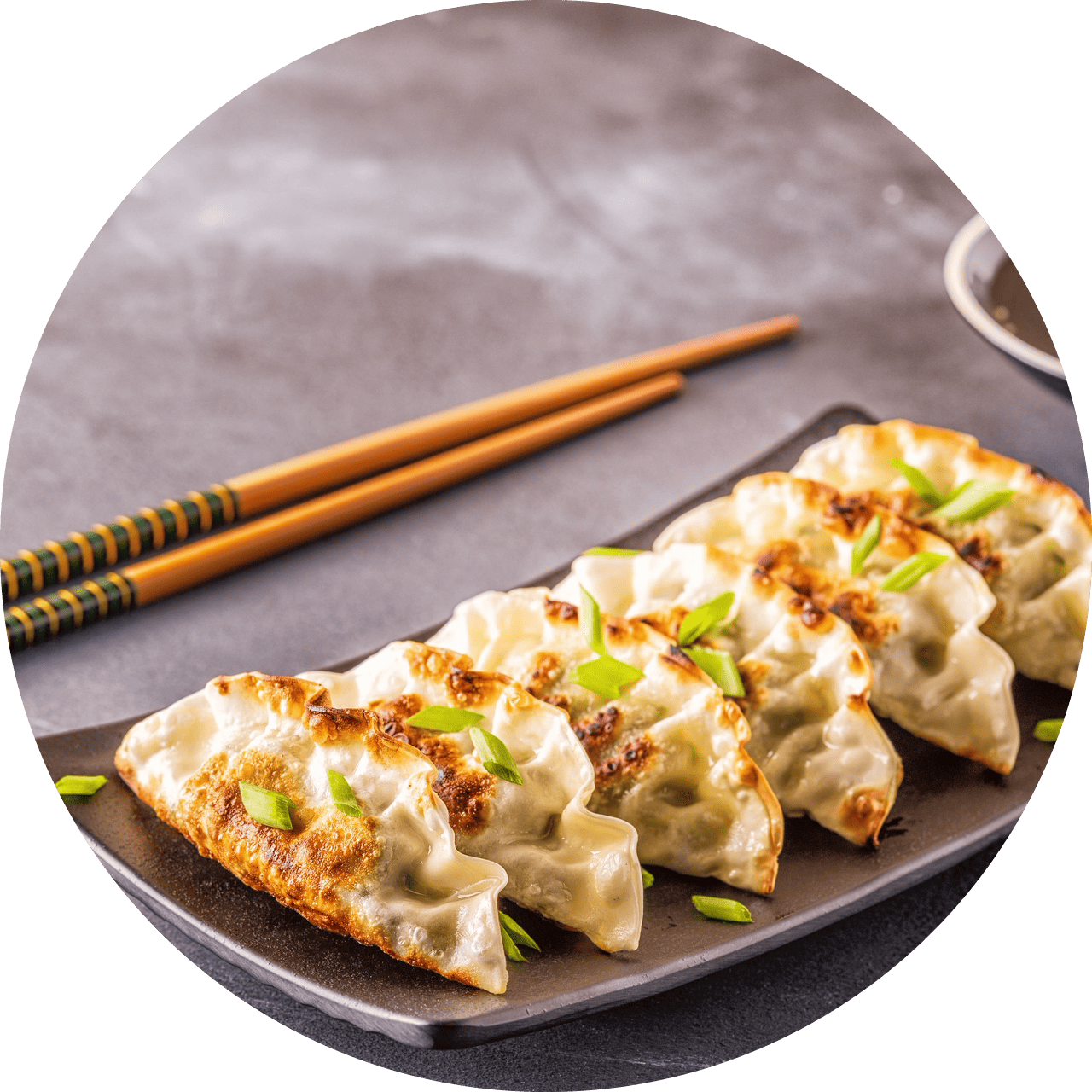 Dumplings congelados: carne molida de res, cerdo, vegetales, ajo, jengibre, salsa de soya, aceite de sésamo, chili oil, ajonjolí, harina de trigo, agua, sal y carbón de coco.