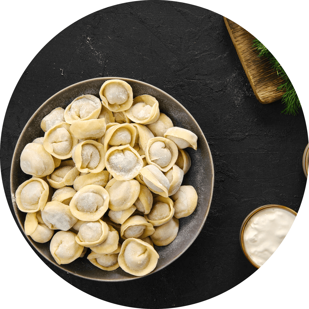 Dumplings congelados: carne molida de res, cerdo, cebolla blanca, perejil, aceite de oliva, pasta de tomate, harina de trigo, agua y sal.