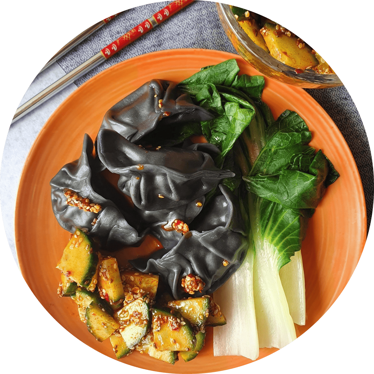 Dumplings congelados; relleno: berenjena (60 %), col china, jengibre, ajonjolí, miso, salsa de soya; masa: harina de trigo, agua, sal y espinaca.